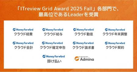 マネーフォワードグループが提供する10プロダクトが、アイティクラウド株式会社主催「ITreview Grid Award 2025 Fall」の各部門にて、最高位である「Leader」を受賞しました。今回受賞したプロダクトは、株式会社マネーフォワードのバックオフィスSaaS『マネーフォワード クラウド』の8プロダクト、マネーフォワードケッサイ株式会社の企業間後払い決済・請求代行サービス『マネーフォワード 掛け払い』、マネーフォワードi株式会社の情シス向け業務OS『マネーフォワード Admina』です。
