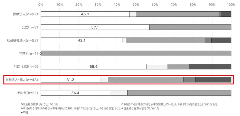 ・開設主体毎の比較では、「個人事業」において給与の引き上げ実施率は42.9%と最も低値でした(図4)。