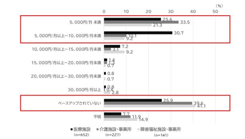 ベースアップの実施率は、医療施設で31%、介護施設・事業所で11%、障害福祉施設・事業所で16%と極めて低く、医療施設と比較し、介護施設・事業所や障害福祉施設・事業所における実施率は特に低値でした(図2)。