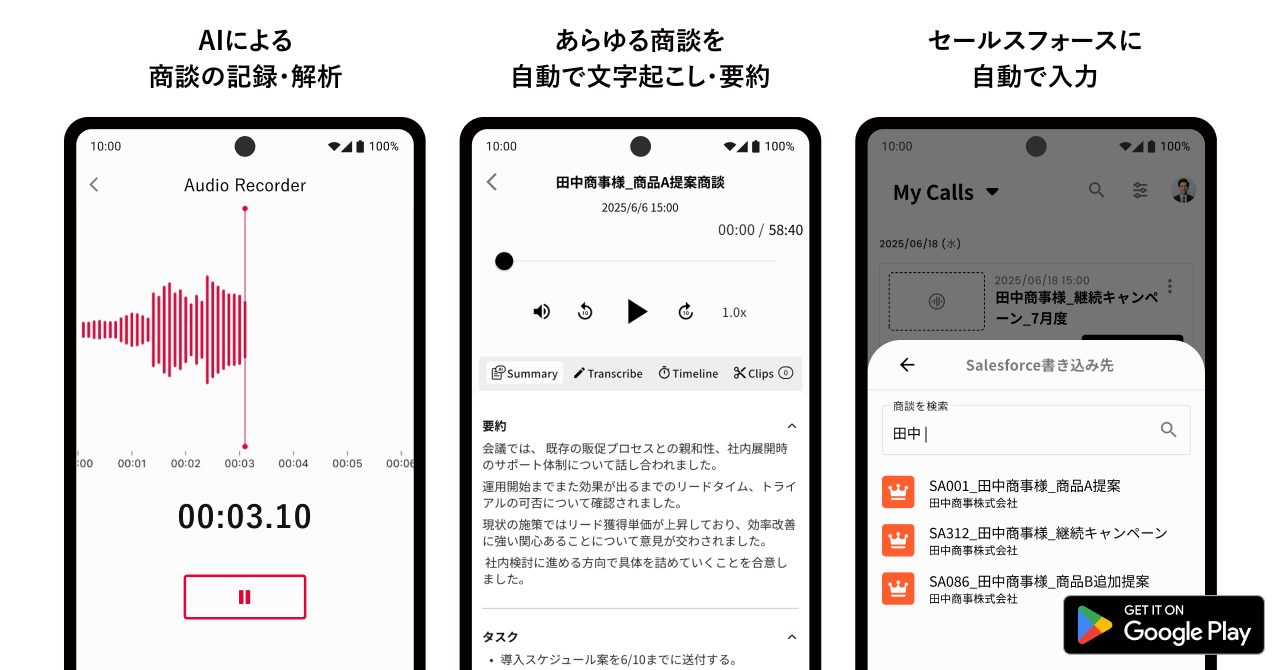 Android版アプリでも、iOS版と同様に録音・文字起こし・要約・CRM/SFA自動入力までをサポート。スマートフォンでの商談記録の活用範囲が広がり、対面を含むオフライン環境での記録強化につながっています。