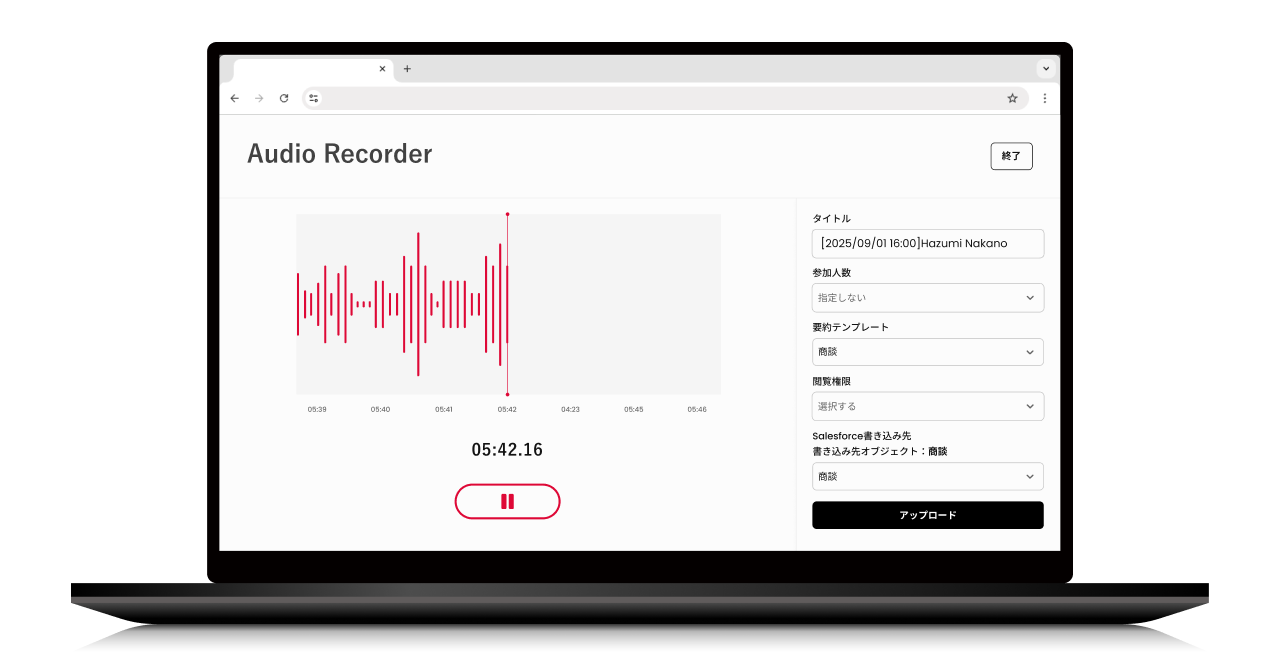 これにより、社用スマートフォンを持たない、またはアプリ利用が制限されている営業組織でも、セキュリティを担保したうえで、対面商談を確実に記録し、AIによる要約・タスク抽出・CRM/SFA自動入力まで一貫して行うことが可能になります。