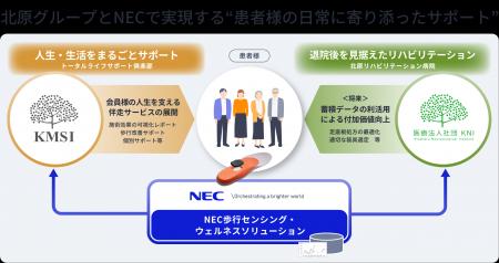 脳神経外科を中心に、予防・救急からリハビリテーション・在宅介護まで一貫した医療を提供する北原グループの医療法人社団KNI(*1、以下「KNI」)と株式会社Kitahara Medical Strategies International(*2、以下「KMSI」)は、日本電気株式会社(*3、以下「NEC」)と連携し、KMSIが提供する会員制サービス「北原トータルライフサポート倶楽部」*4の会員を中心として、NECの「歩行センシング・ウェルネスソリューション」*5を活用した新たなサービスを2026年1月頃より提供開始します。