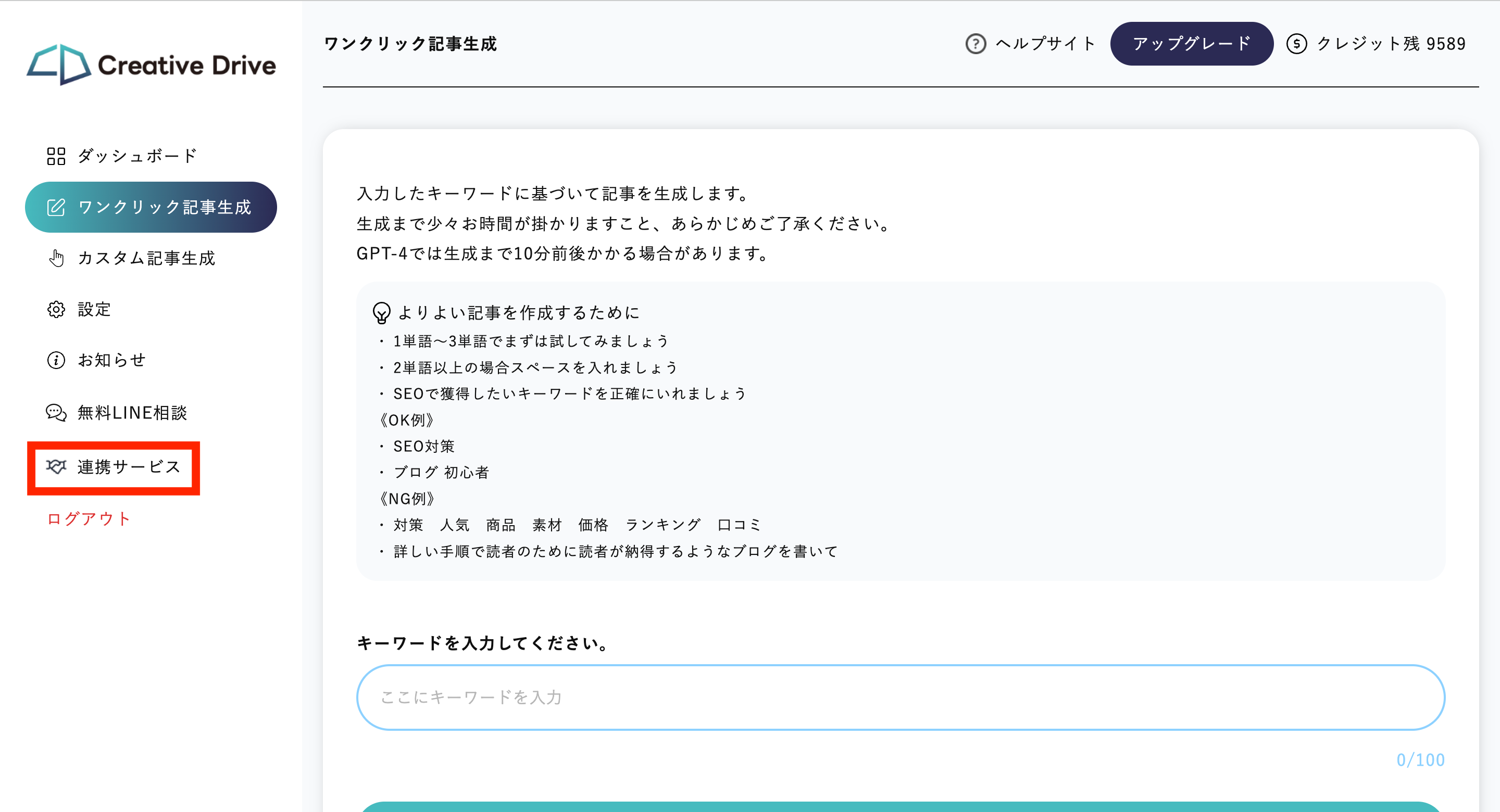 「Creative Drive」管理画面のサイドバーの「連携サービス」ボタンから、REGAL COREのサービス画面に遷移することができます。