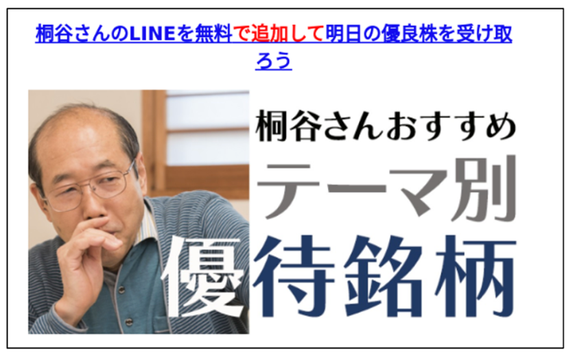 弊社としては、以前から注視していた、商材の実態はわからないが無料を謳いLINE登録を促す訴求表現や、「料金はかからない」「無料で明日の優良株を受け取る」などの訴求表現が景表法などの観点からも不審に感じたため、当該広告において、桐谷様をはじめ、利用されている著名人に画像等の利用を許諾しているかを実際に確認したところ、無断で利用された広告であることが判明しました。