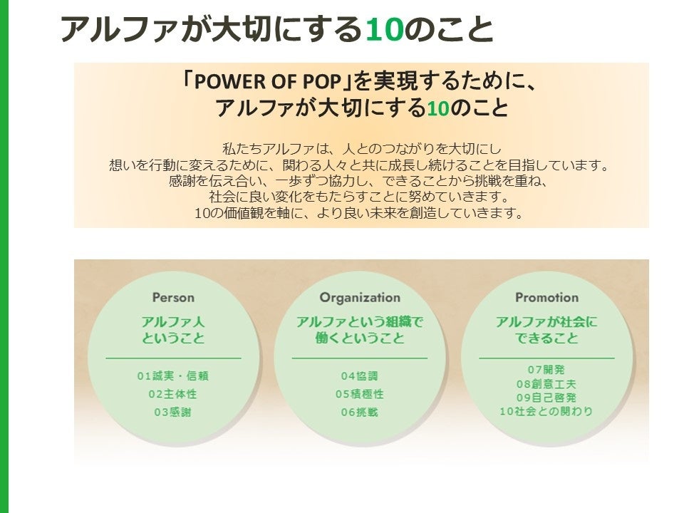 アルファは、企業として大切にすべき10の価値観を策定。