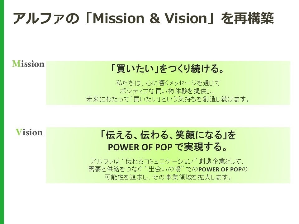 - Mission:「買いたい」をつくり続ける心に響くメッセージを通じてポジティブな買い物体験を提供し、未来にわたって“買いたい”という気持ちを創造していく。- Vision:「伝える・伝わる・笑顔になる」をPOWER OF POPで実現する伝わるコミュニケーション創造企業として、需要と供給をつなぐ“出会いの場”での可能性を追求します。