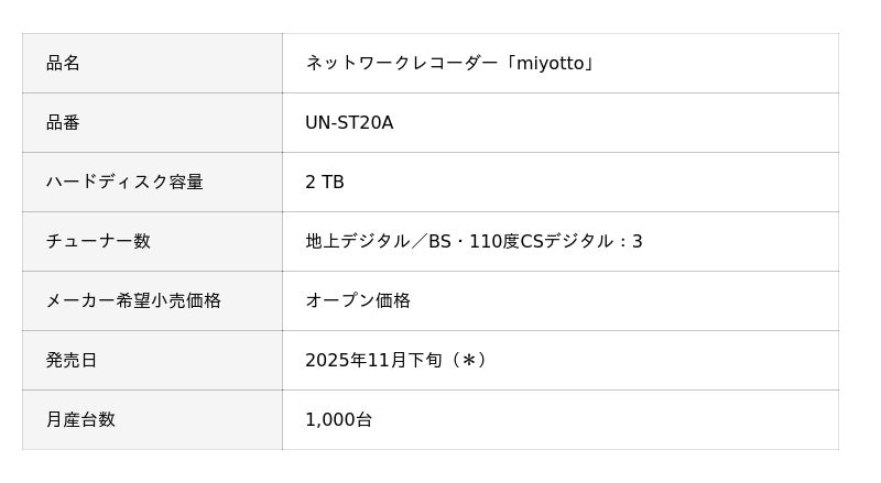 パナソニック株式会社(以下、パナソニック)は、専用アプリを通じてスマートフォンやタブレット、ストリーミング端末やスマートプロジェクターなど様々なデバイスでリアルタイムのテレビ番組や録画番組を視聴できる(※1)ネットワークレコーダー「miyotto」UN-ST20Aを2025年11月下旬(*)に発売します。