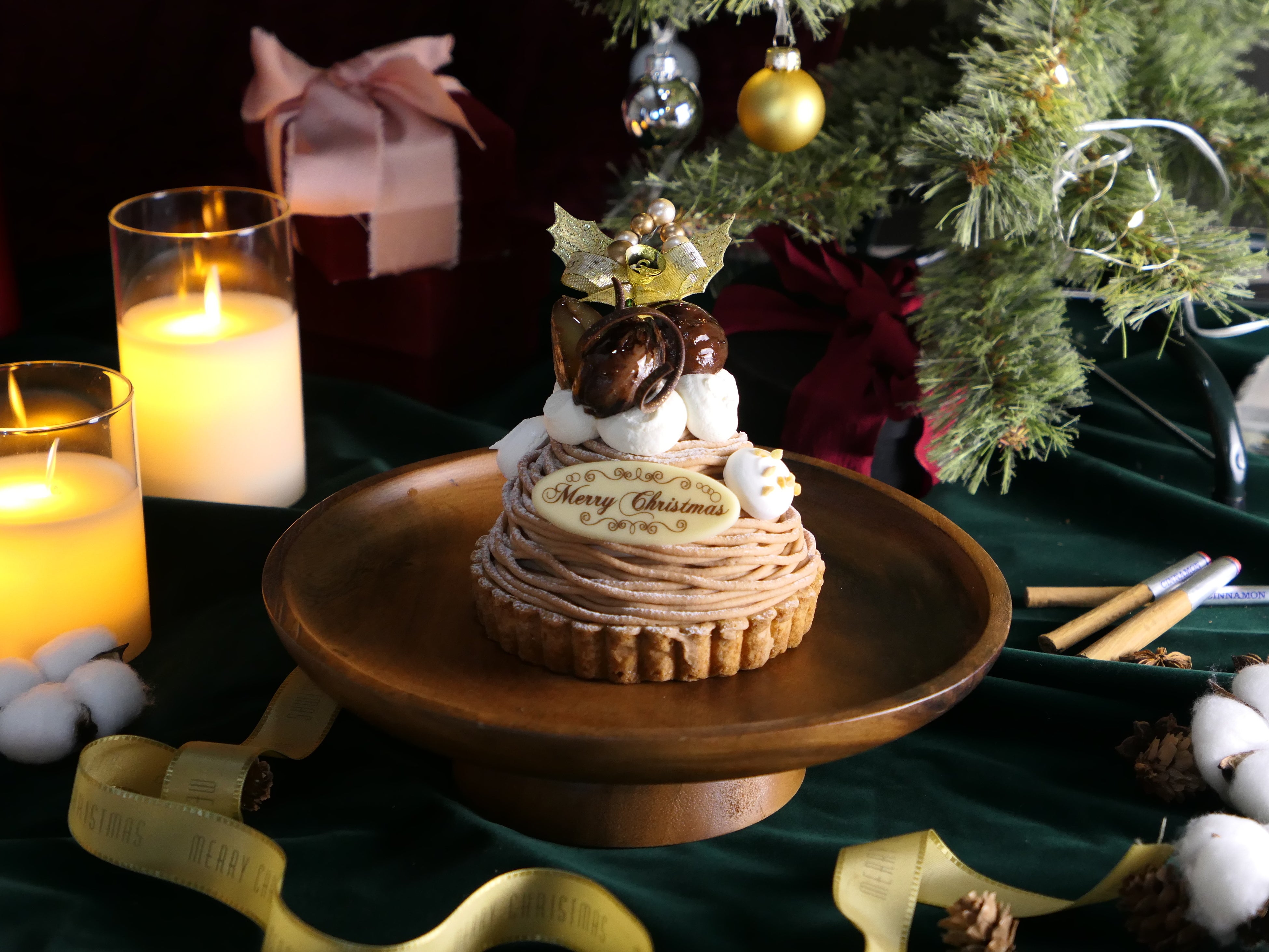 イタリア産の栗を使用した濃厚なマロンペーストに、軽やかなクリームを重ね、仕上げに和栗をトッピング。異なる産地の栗が織りなす香りと味わいの奥行きをお楽しみいただけます。繊細でやさしい甘みが、クリスマスにふさわしい上品な余韻を残します。普段はショップでプチガトーとして人気のモンブランを、今年はクリスマス限定でホールケーキとしてご用意。