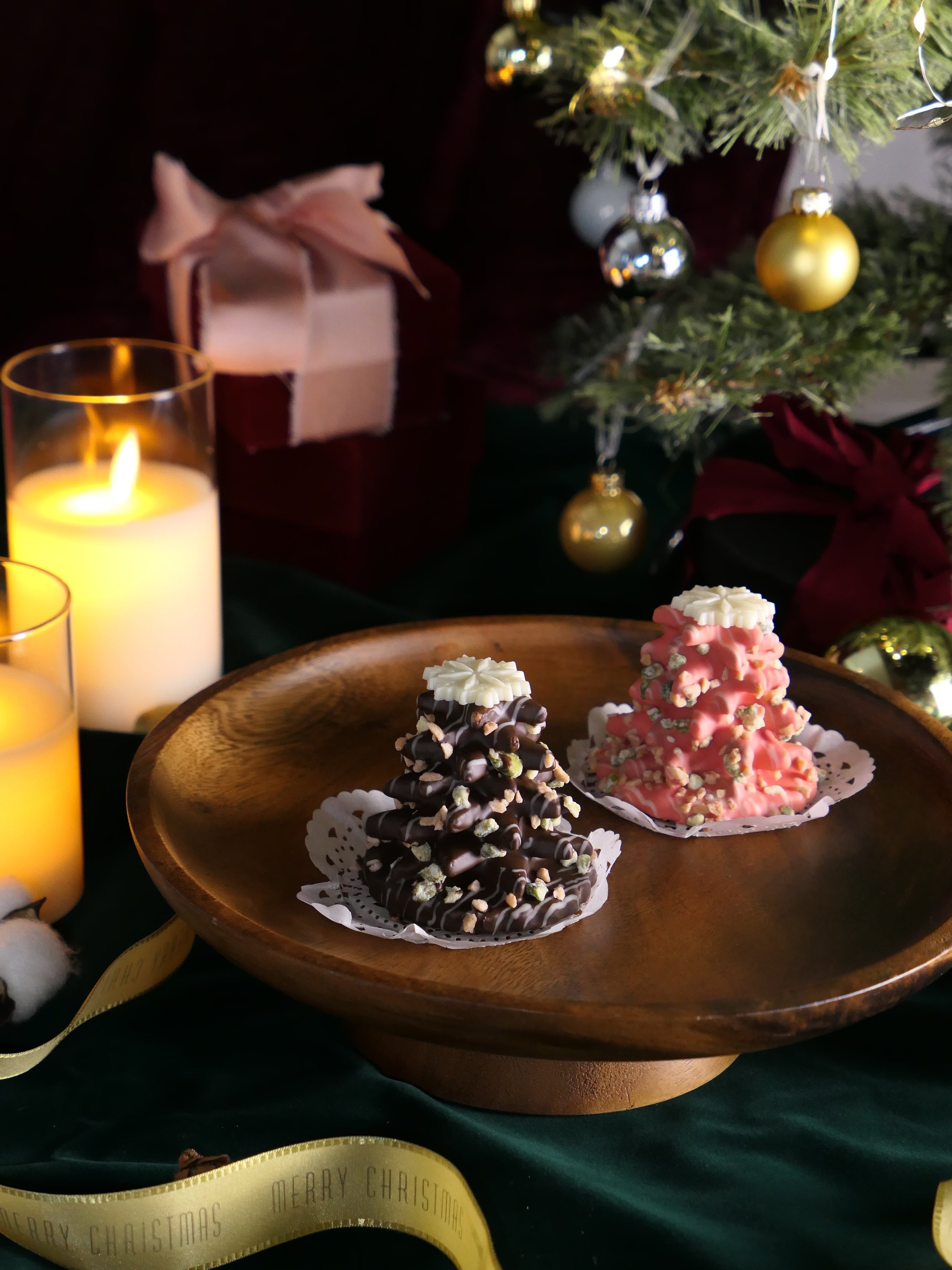 ココアとプレーン、2種類のクッキーを重ね合わせ、フランス産のチョコレートといちごチョコでコーティングしてツリー型に仕立てました。サクッとした食感のクッキーに、チョコレートのやさしい甘みを重ねた、ツリー型のかわいらしいスイーツです。
