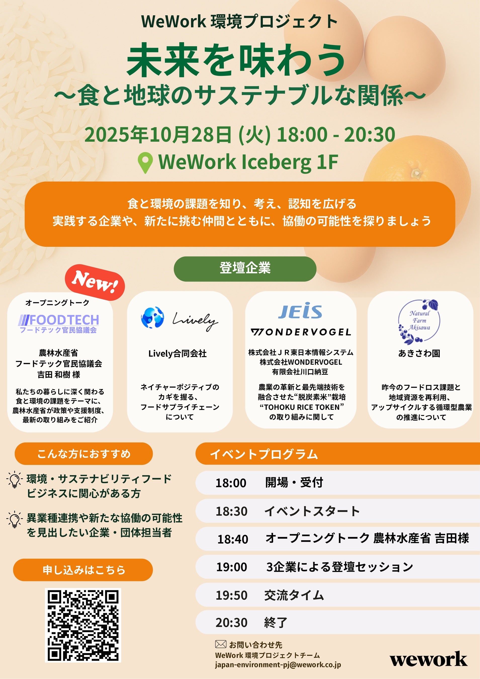 この度、2025年10月28日(火)にWeWork Japan が主催するイベント「未来を味わう~食と地球のサステナブルな関係~」にて、Lively合同会社(本社:東京都千代田区)Founder & CEO 種田 毅とCo-Founder & Co-CEO 三浦 友見の登壇が決定しました。当日は「ネイチャーポジティブのカギを握るフードサプライチェーン」というテーマで、リジェネラティブ農業やアニマルウェルフェアに関する弊社の取り組みをご紹介いたします。