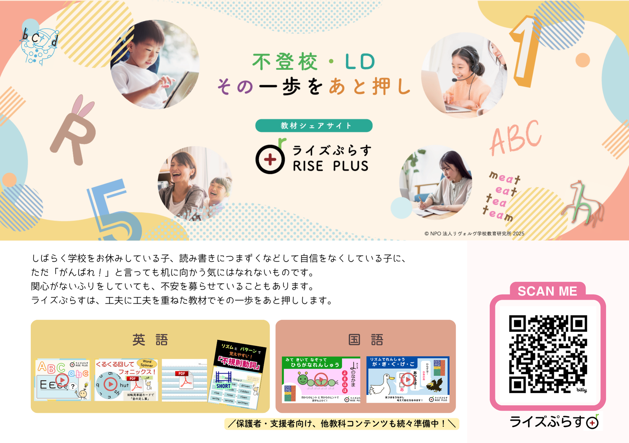 不登校やLDなどとされる子らの学びと育ちの支援に取り組む、特定非営利活動法人リヴォルヴ学校教育研究所(所在地:茨城県つくば市、代表:小野村哲、以下:同法人)は、2025年10月24日、同法人が運営する「むすびつくばライズ学園(旧ライズ学園)」での実践の中から得られた成果のシェアを目的としたWebサイト「ライズぷらす」において、新しいキャンペーンを開始しました。