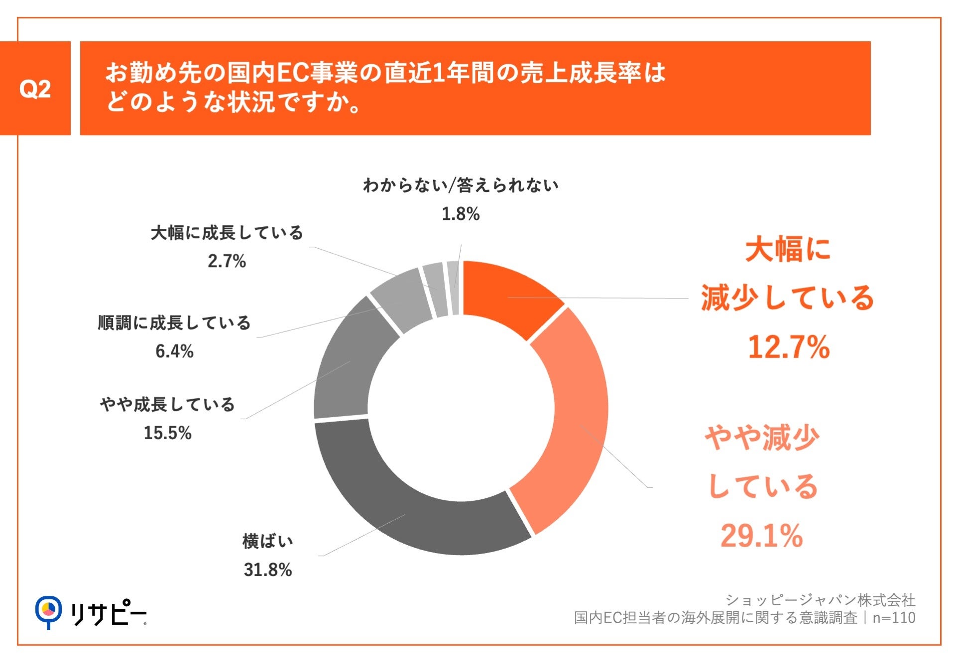 「Q2. お勤め先の国内EC事業の直近1年間の売上成長率はどのような状況ですか。」(n=110)と質問したところ、「大幅に低下している」が12.7%、「やや低下している」が29.1%という回答となりました。