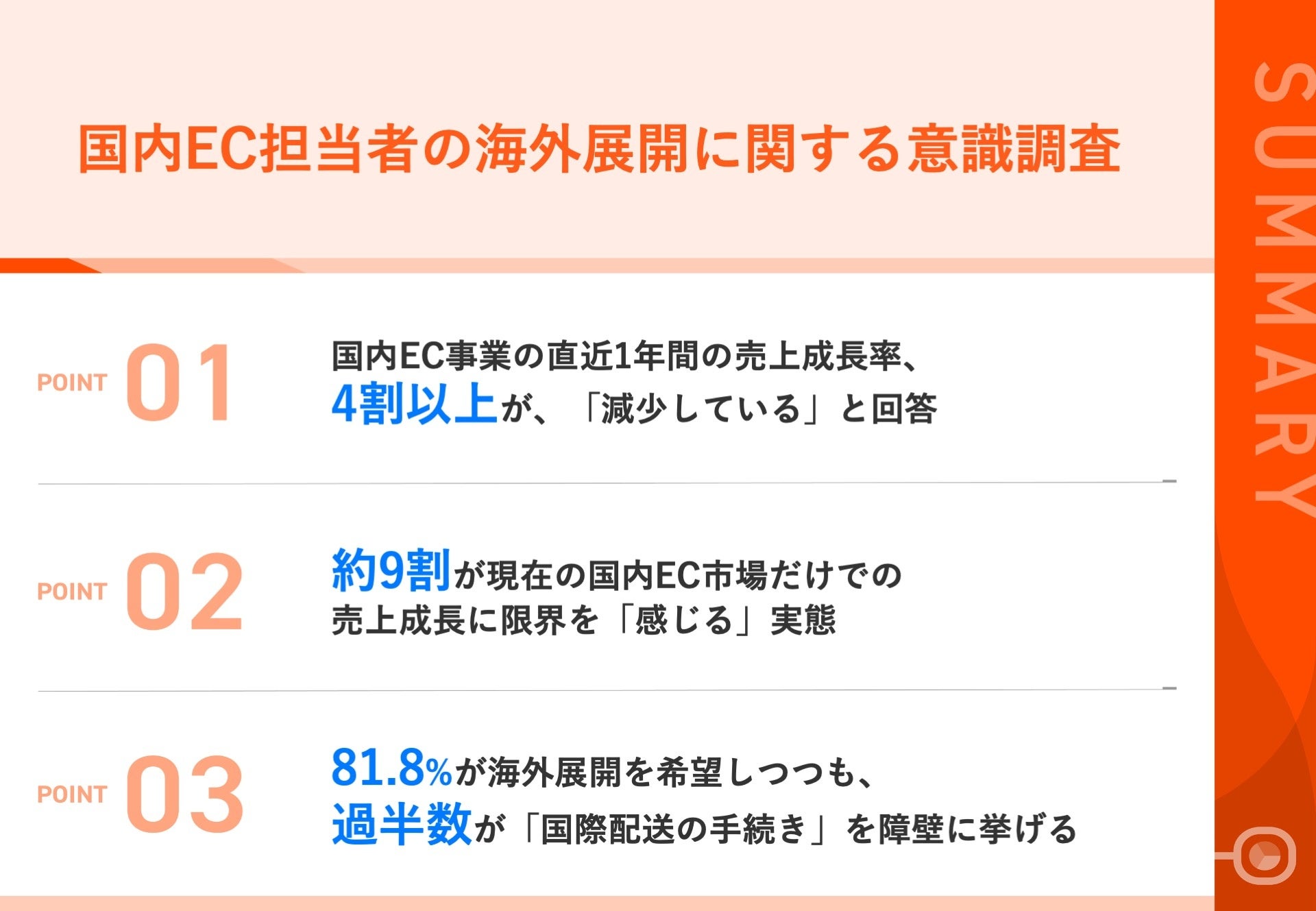 - 01|国内EC事業の直近1年間の売上成長率、4割以上が、「減少している」と回答- 02|約9割が現在の国内EC市場だけでの売上成長に限界を「感じる」実態- 03|81.8%が海外展開を希望しつつも、過半数が「国際配送の手続き」を障壁に挙げる
