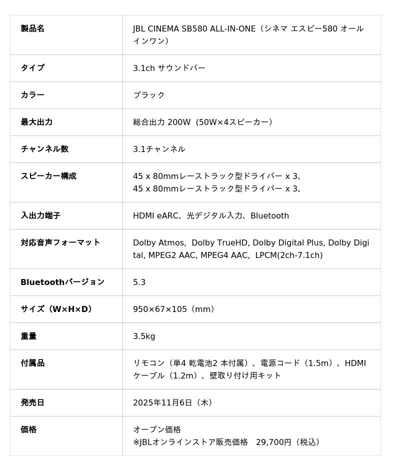 ハーマンインターナショナル株式会社(本社:東京都千代田区、代表取締役:桑原拓磨)は、アメリカ カリフォルニア発祥の世界最大級のオーディオブランドであり、日本においてワイヤレススピーカー7年連続販売台数No.1※1に輝く「JBL」から、「Dolby Atmos(R)(ドルビーアトモス)」搭載により、没入感のあるサラウンドが楽しめるオールインワンサウンドバー「JBL CINEMA SB580 ALL-IN-ONE(シネマエスビー580オールインワン)」を2025年11月6日(木)より発売いたします。