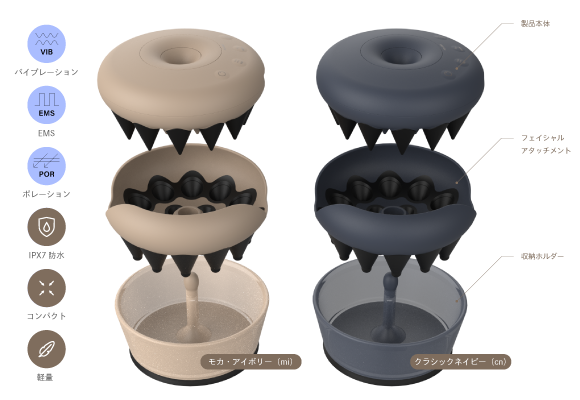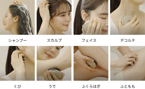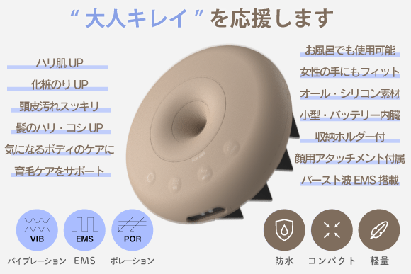 お風呂でスカルプケアはもちろん、アタッチメントを装着してフェイシャルケア・ボディケアとトータルケアに進化したオールシリコン素材の斬新な美髪美顔器です。