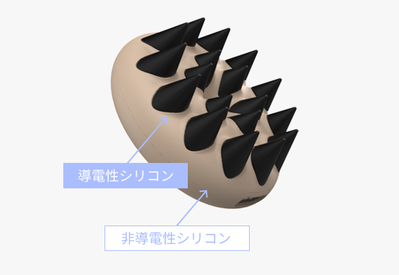 全体がシリコン素材で肌触りが良く、必要な部分だけ電気を通す構造となっています。