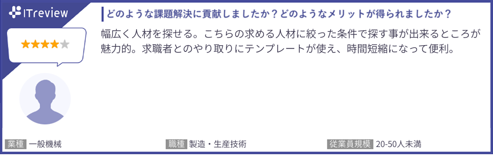 また、必要項目を設定することで、面倒な職務経歴書を読む必要もなく、すぐに求職者へアプローチできるので、面接まで最短1日で設定可能です。しかも、料金は定額制であるため、何人採用しても追加費用はかかりません。採用にかかる工数の削減にも寄与する、費用対効果の高いサービスです。