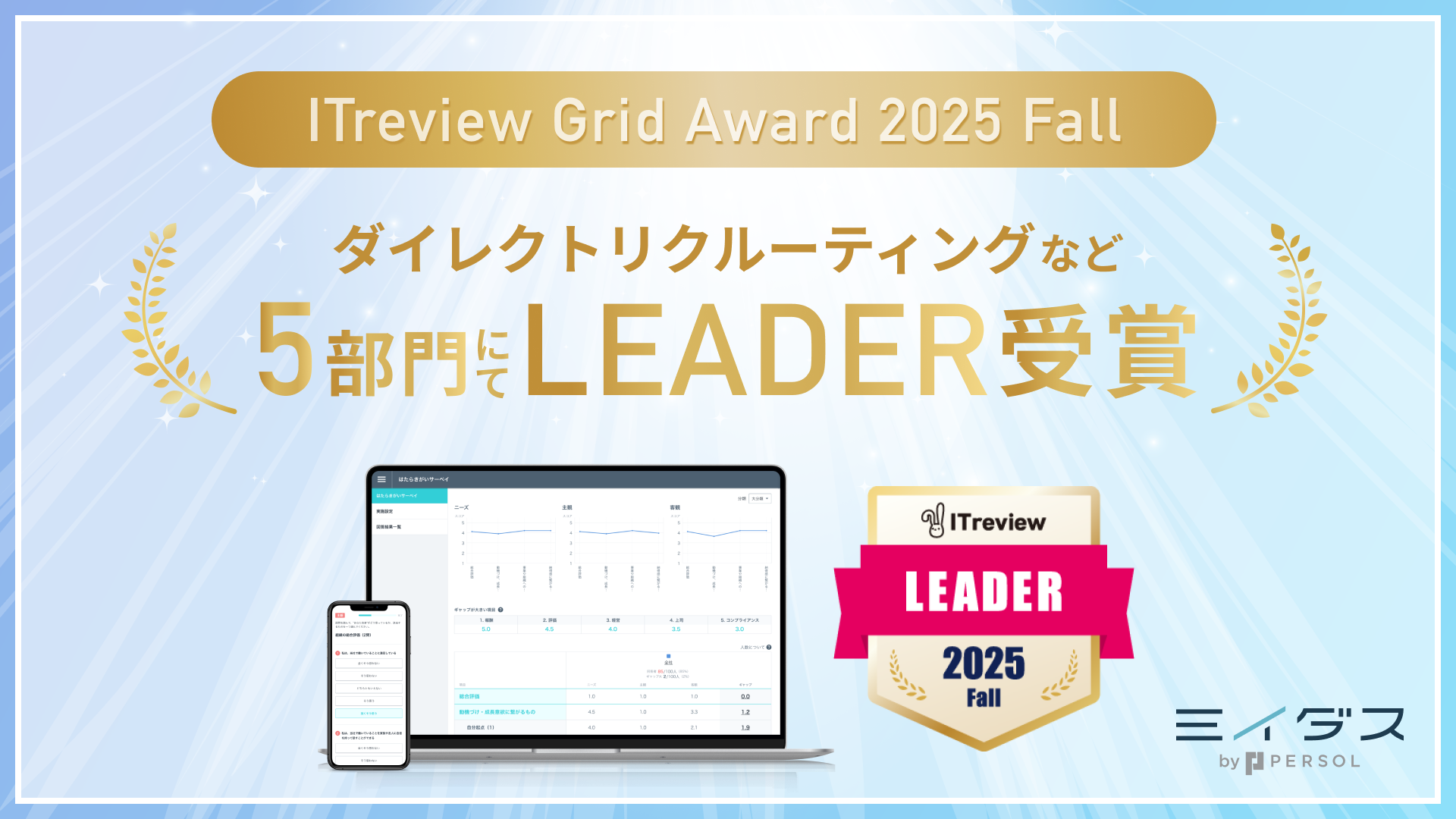 「はたらいて、笑おう。」をビジョンに掲げるパーソルグループの中途採用サービス『ミイダス』を運営するミイダス株式会社(本社:東京都渋谷区、代表取締役社長:後藤 喜悦)は、アイティクラウド株式会社(本社:東京都港区、代表取締役社長兼CEO:黒野源太)が主催する「ITreview Grid Award 2025 Fall」にて、5部門で最高位の「Leader」を受賞しました。