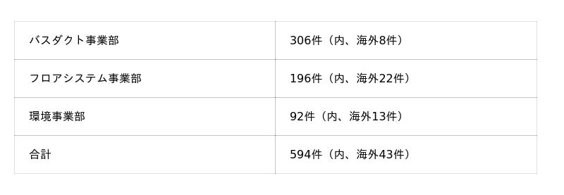 当社は創業以来、独創的な製品開発にこだわり続け、これまでに取得した特許・意匠・実用新案の総件数は594件(内、海外43件)に上り、現在進行形でイノベーションを加速させています。なお、創業から現在までに取得した知的財産は以下の通りです。