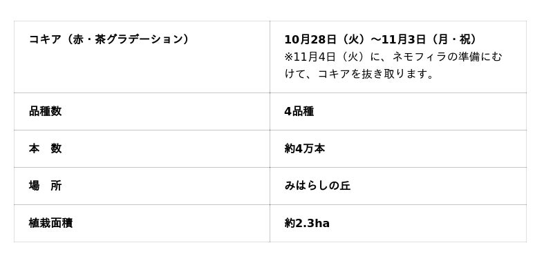 コキアはヒユ科ホウキギ属で、ユーラシア大陸の乾燥地帯原産の一年草です。和名の「ほうき草」は、かつて枝や茎を乾燥させて、ほうきを作っていたことに由来します。紅葉を終えた一部のコキアは乾燥・保管され、冬季に登場する「干支の巨大地上絵」の資材として利用されます。丘を彩ったコキアが、季節を超えて新たな姿へと変化する様子も見どころの一つです。