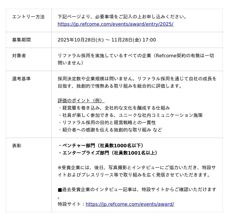本年も、リファラル採用成功に向けて優れた取り組みを行っている企業を募集し、各企業の取り組みや工夫、成果を発信することで、より良い採用のあり方を広めることを目指しています。アワードへのエントリープロセスを通じて自社の取り組みを客観的に振り返る機会や、他社事例から新たな施策のヒントを得られるなど、企業にとって多面的な効果が期待されます。