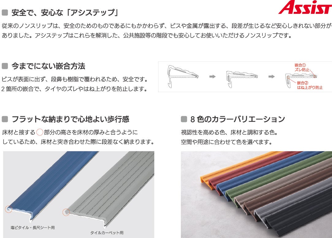 株式会社アシストは、1969年の創業以来、階段や床の段差など、日常生活の中の何気ない “一段一段に こころをこめて” 階段滑り止めや床材押え金物を提供してまいりました。