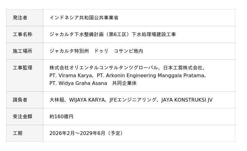 株式会社大林組(本社:東京都港区、社長:佐藤俊美)、JFEエンジニアリング株式会社(本社:東京都千代田区、社長:福田一美)、PT. WIJAYA KARYA (Persero), Tbk.(本社:インドネシア共和国、社長:Agung Budi Waskito)、およびPT. JAYA KONSTRUKSI MANGGALA PRATAMA, Tbk.(本社:インドネシア共和国、社長:Budi M. Sianipar)は、共同企業体を組成し、インドネシア共和国公共事業省から日本国政府の円借款事業によるジャカルタ下水整備計画(第6工区)下水処理場建設工事(以下、「本工事」)を受注しました。本工事は、ジャカルタ特別州において当共同企業体が2023年に受注し、建設中のジャカルタ下水整備計画(第1工区)下水処理場建設工事(※1)に続くプロジェクトです。
