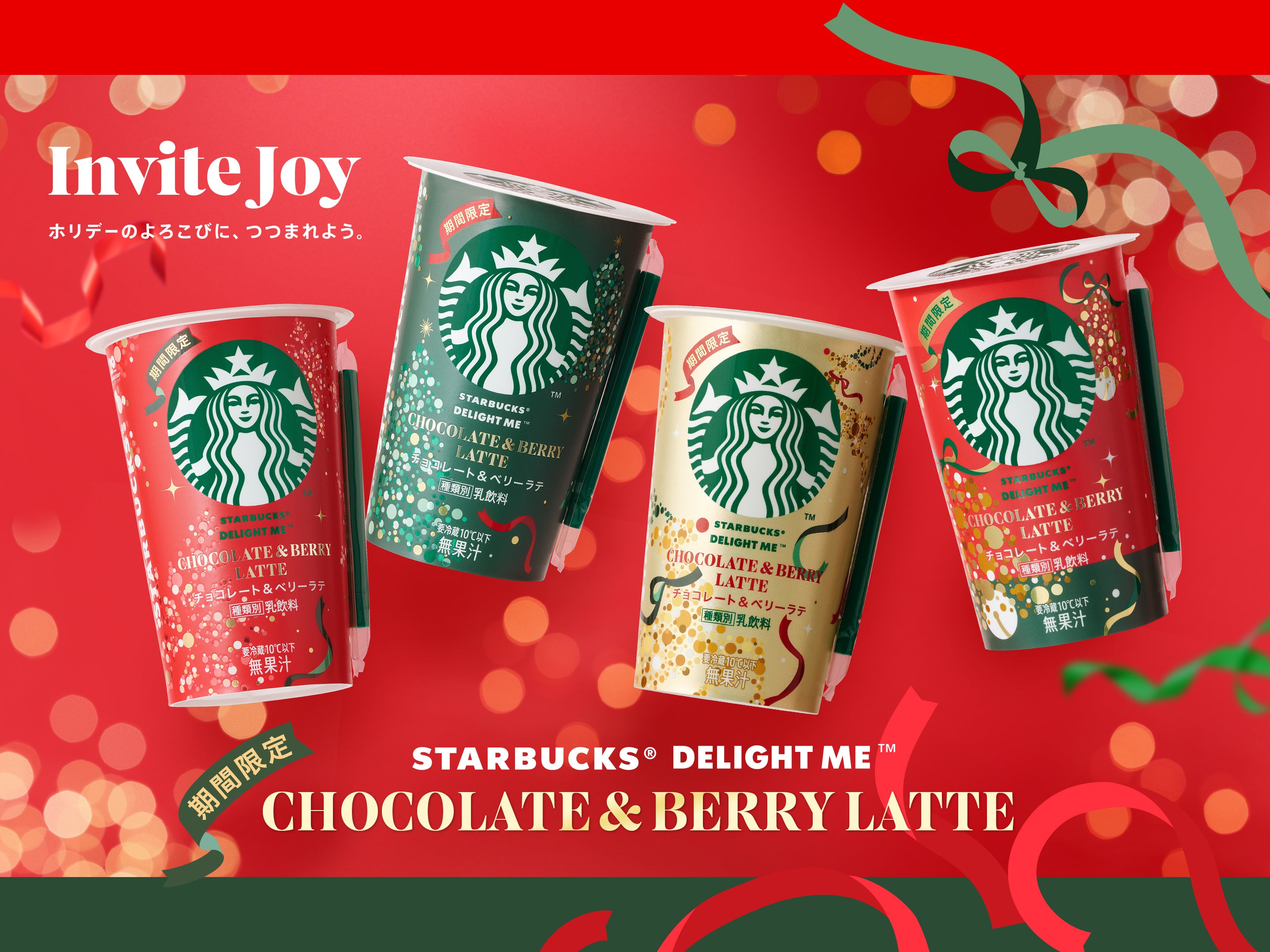 今年は「Invite Joy ‐ホリデーのよろこびに、つつまれよう‐」をテーマに、「スターバックス(R) DELIGHT ME(TM) チョコレート&ベリーラテ」を、4種類のきらめくパッケージデザインで展開します。季節に合わせた味わいに、スターバックスならではの新しさやワクワク感、驚きを加えたシリーズ「スターバックス(R) DELIGHT ME(TM)」の第2弾で、ホリデーを彩る魔法がかけられたような“DELIGHTなひととき”をお届けします。