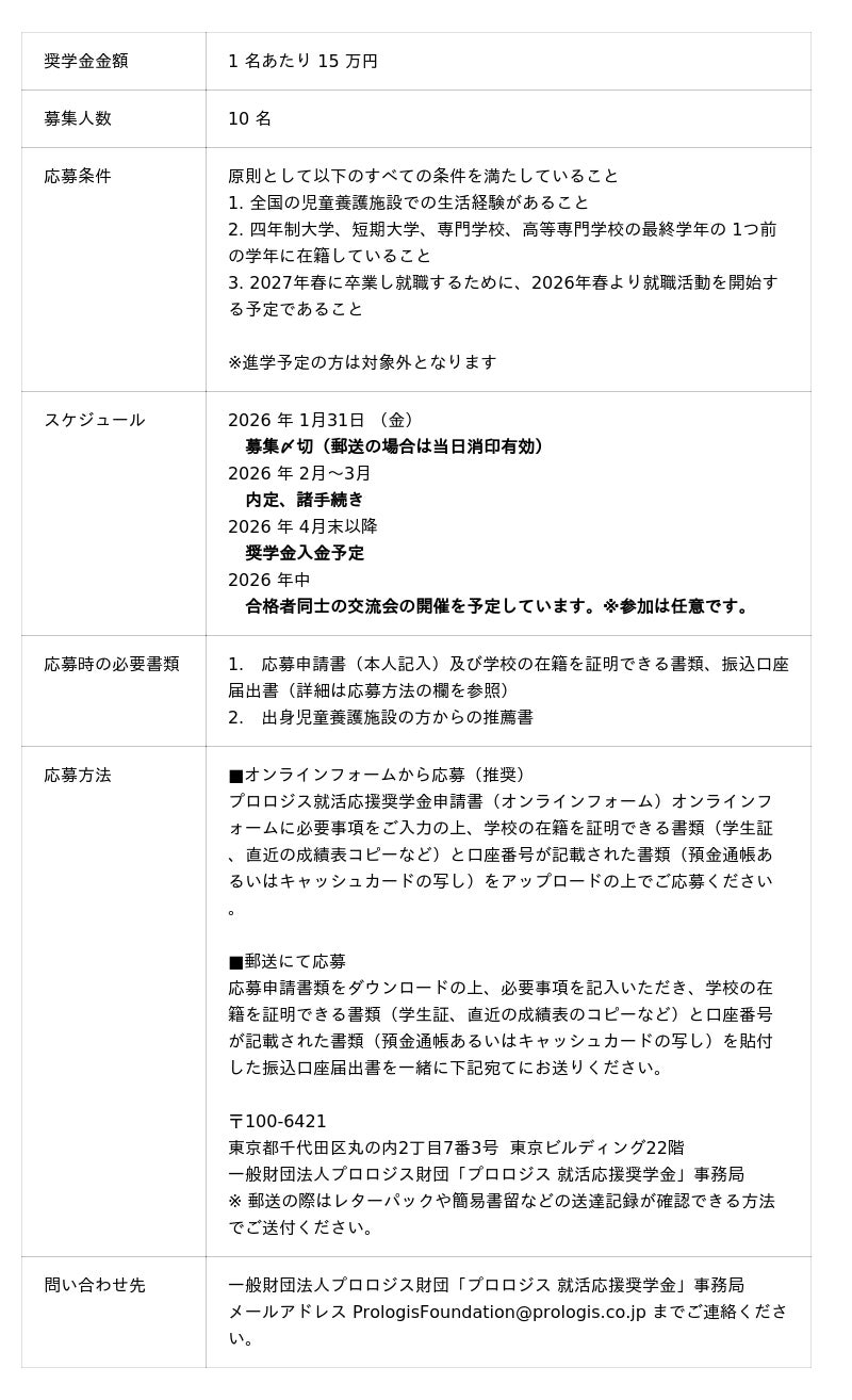 「プロロジス 就活応援奨学金」は、児童養護施設から進学し就職を目指す学生を対象とし、2019年の開始以降、今回が5回目の募集となります。返済不要の給付型奨学金であり、児童養護施設から大学、短大、専門学校、高等専門学校に進学し在学中、かつ、2027年春に就職するための就職活動に臨む学生の皆さんの経済的な不安を軽減することで就職活動を支援します。応募締め切りは、2026 年 1月31日です。