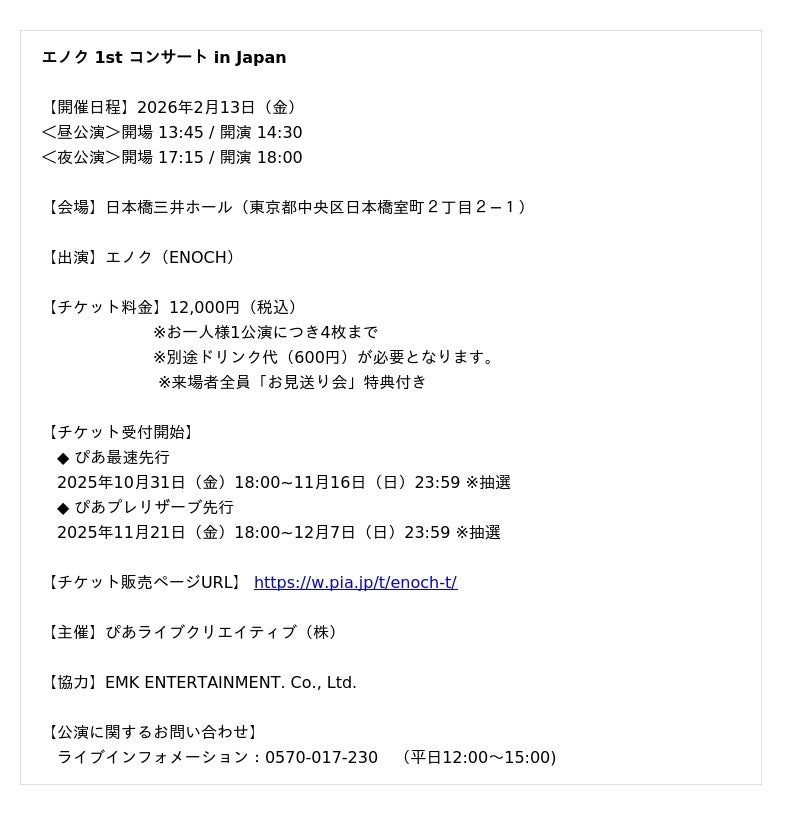韓国の実力派ミュージカル俳優 エノク(ENOCH)が、2026年2月、日本橋三井ホールで日本初となる単独公演『エノク 1st コンサート in Japan』を開催することが決定した。