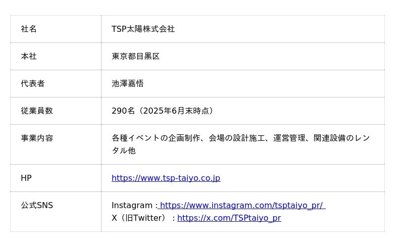 2025年で設立70周年を迎えたTSP太陽株式会社は、空間ソリューションによるイベントコンサルティングから企画・制作まで、あらゆる感動の場を一気通貫した支援で創造するプロフェッショナル集団です。国際的なビッグイベントを始め、あらゆるイベントに携わるデザイン・コンサルティング会社として、収益の最大化を図る事前収支計画から企画・クリエイティブ制作・建築設計・施工・運営までをトータルソリューションとして提供しています。PR・プロモーション・イベントに付随するホスピタリティサービスもお任せください。近年では、豊富な経験から培われた独自のノウハウを駆使し、ダイバーシティやSDGs・ESGへの取り組みを積極的に推進しています。