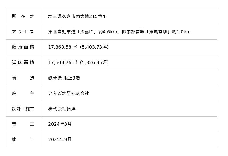 このたび、関東圏で物流および建設事業を営む株式会社拓洋(以下、「拓洋」という。)と連携することにより、冷凍冷蔵倉庫の建設に関するノウハウおよびマスターリースを受けていただくことによる顧客基盤を活用し、食品卸業界のリーディングカンパニーである日本アクセス株式会社(以下、「日本アクセス」という。)をお客様として迎えた専用の冷凍冷蔵施設として、「いちご久喜物流センター」の竣工を迎えることとなりました。