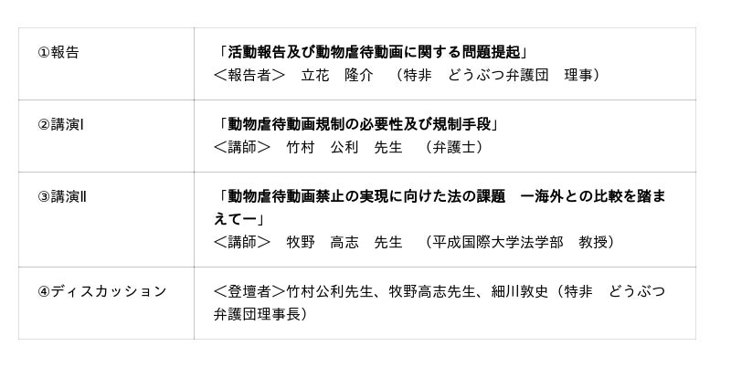 動物虐待動画等をなくすことはできないか、かねてより法規制の必要性を提唱されてきた弁護士の竹村公利氏、動物法関連の研究をされている牧野高志教授を迎え、この課題に向き合うシンポジウムとしたいと思います。