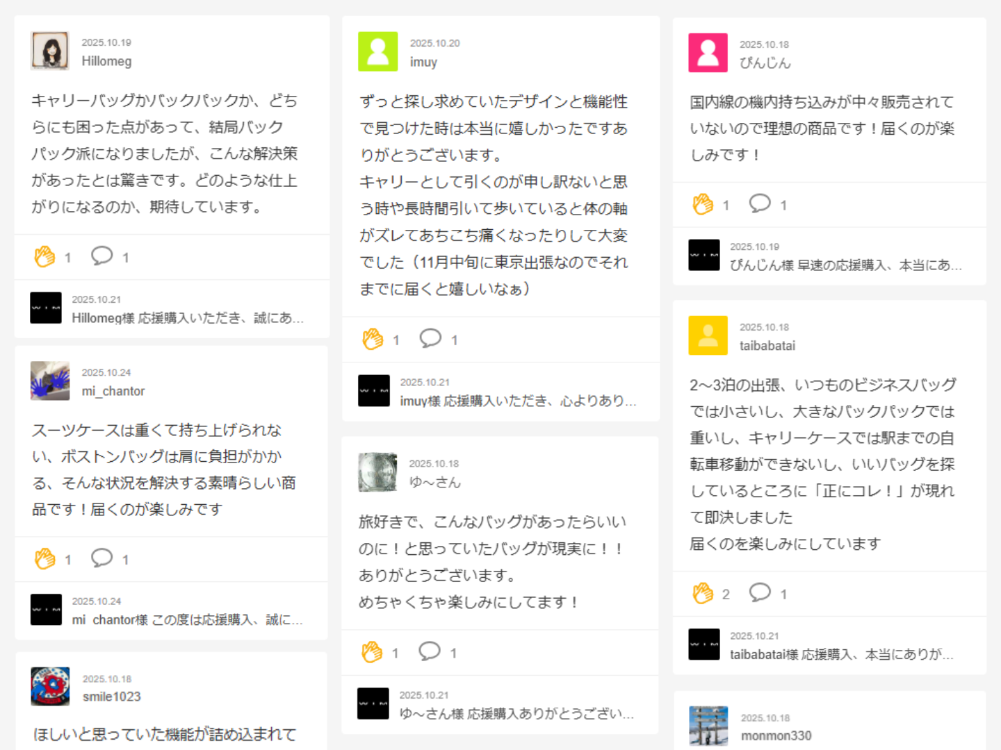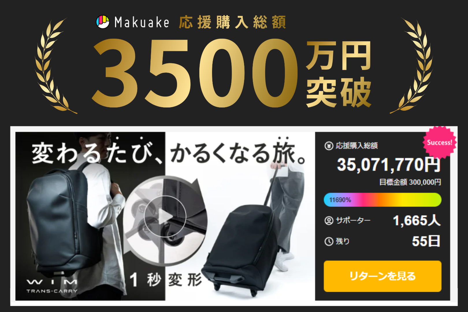 開始10分で応援購入額1,000万円を突破し、24時間で3,000万円超と爆発的な反響を記録。「スーツケース⇔リュックに瞬間変形」という新発想が、"場面ごとに最適なバッグが欲しい" という旅行者の潜在ニーズを捉えた結果となりました。