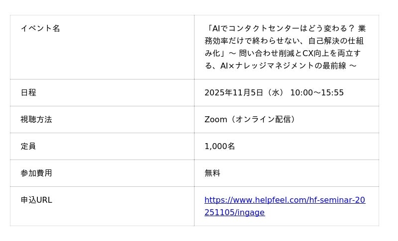 顧客対応クラウド「Re:lation(リレーション)」を提供する株式会社インゲージ(本社:大阪府大阪市、代表取締役:和田 哲也)は株式会社Helpfeelをはじめとする共催企業11社とともに、オンラインカンファレンス「AIでコンタクトセンターはどう変わる? 業務効率だけで終わらせない、自己解決の仕組み化」を2025年11月5日(水)に開催いたします。