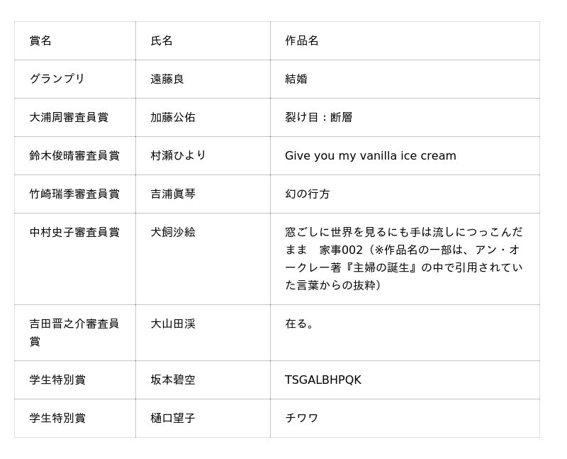 この度は栄誉ある賞をいただき、誠にありがとうございます。審査員の中村史子氏、作品を選んでくださり心より感謝申し上げます。