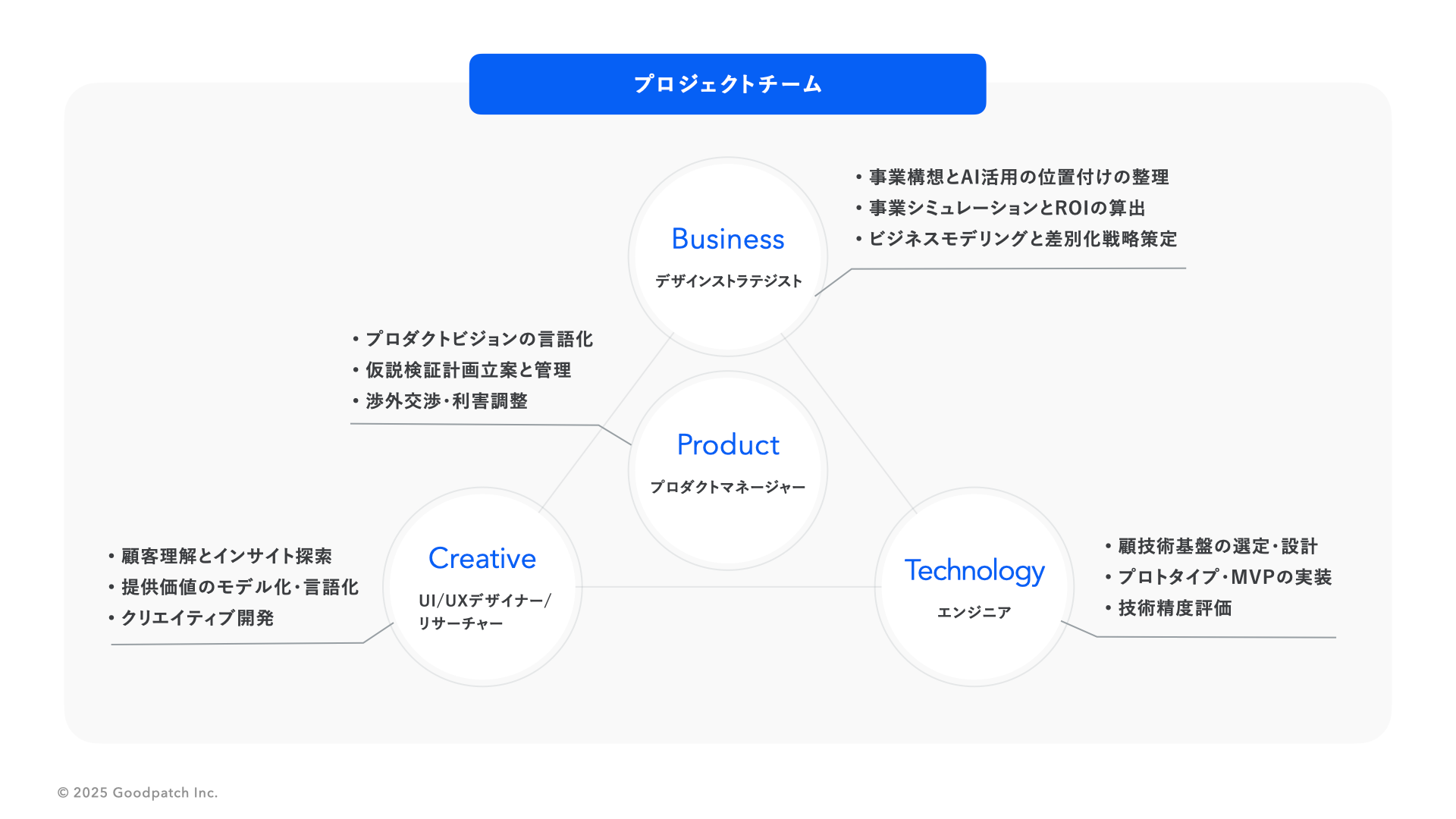・グッドパッチがこれまで培った知見を生かし、事業・技術・デザインの専門家チームが、AIを活用した新規事業創出から既存プロダクトへのAI導入や組織浸透まで、包括的にサポートすることで、企業の継続的な事業成長や企業変革を後押しする