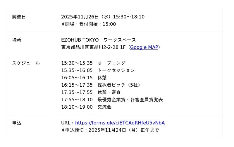 この度、11月26日(水)にEZOHUB TOKYOにて、成果報告会を実施いたします。成果報告会では、採択者によるピッチや第一期生のトークセッション、交流会なども予定しております。