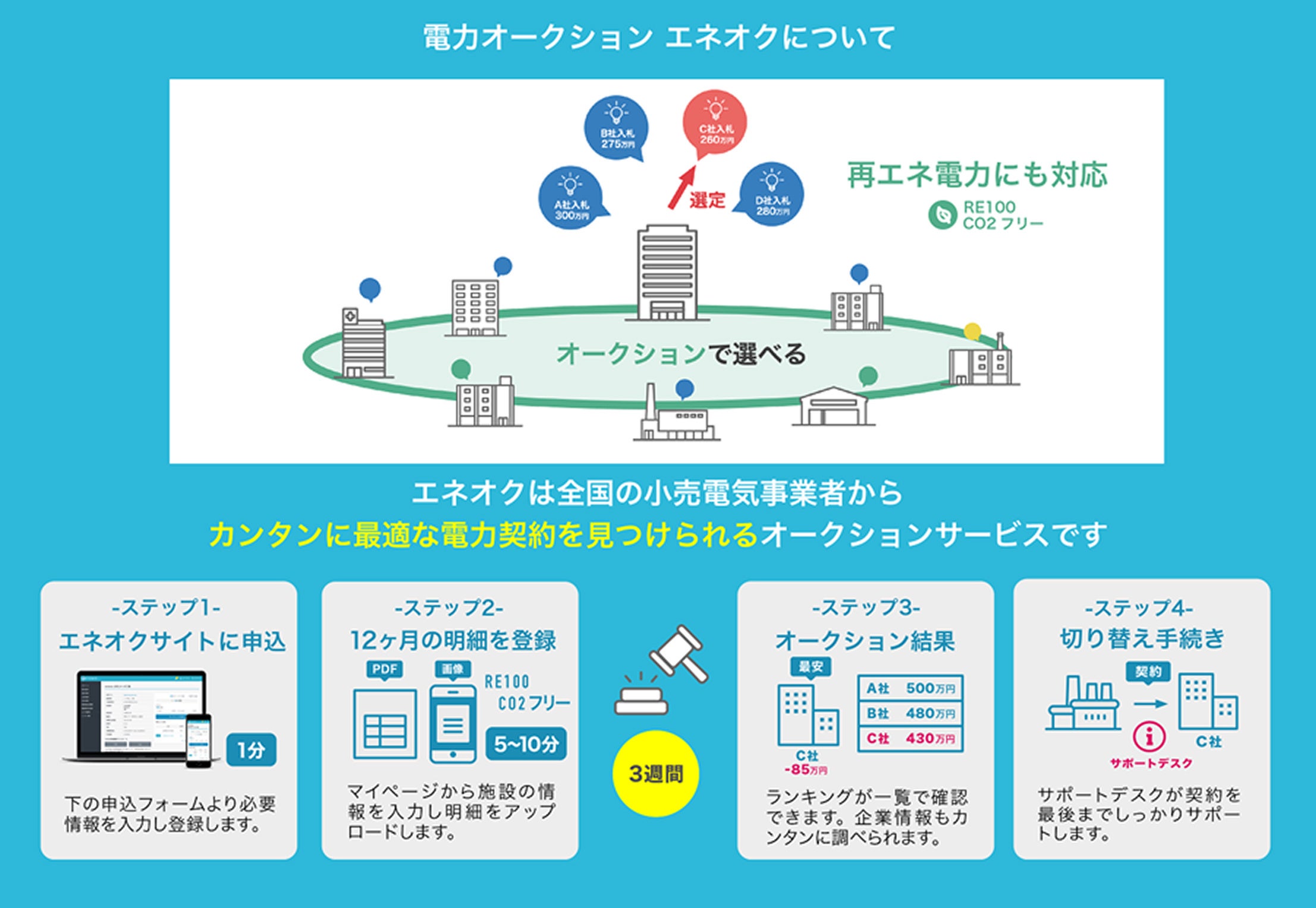環境省HPにも掲載されている電力調達プラットフォーム「エネオク」は、企業・自治体が無料で電力調達の見直しを行えるサービスです。50社以上の電力会社から入札を受けられ、10%以上の電気代削減と業務効率化を同時に実現します。また、非化石証書やJクレジットなどの環境価値取引、再エネ導入支援も国内最安水準の手数料で提供しています。