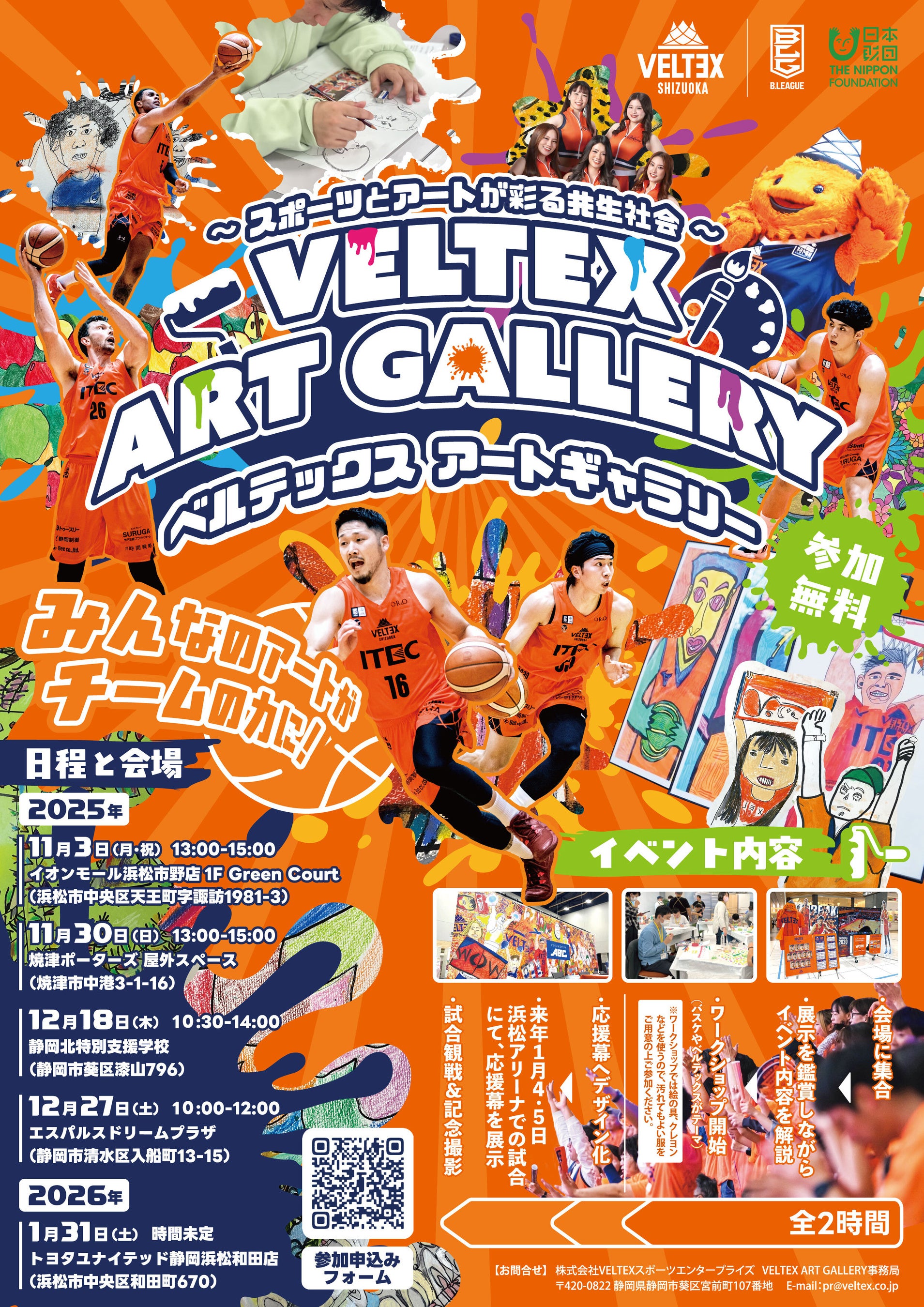 この度、本年6月に公益社団法人ジャパン・プロフェッショナル・バスケットボールリーグ(B.LEAGUE)と公益財団法人日本財団が実施している地域課題解決を推進する取り組み「B.LEAGUE×日本財団まちづくり助成 第1弾まちづくり事業」に採択された「VELTEX ART GALLERY」ついて、2025-26シーズンの活動概要が以下の通り決定いたしましたので、ご案内いたします。