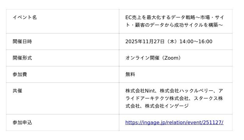 顧客対応クラウド「Re:lation(リレーション)」を提供し、6,000社以上(※1)の導入実績を誇る株式会社インゲージ(本社:大阪府大阪市、代表取締役:和田 哲也)は、2025年11月27日(木)に、EC事業の売上最大化と顧客体験(CX)向上をテーマにした共催ウェビナー「EC売上を最大化するデータ戦略~市場・サイト・顧客のデータから成功サイクルを構築~」を開催します。
