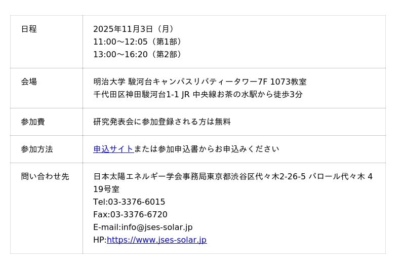 ※本件に関するお問い合わせは、日本太陽エネルギー学会事務局(Tel:03-3376-6015、E-mail:info@jses-solar.jp)までご連絡ください。