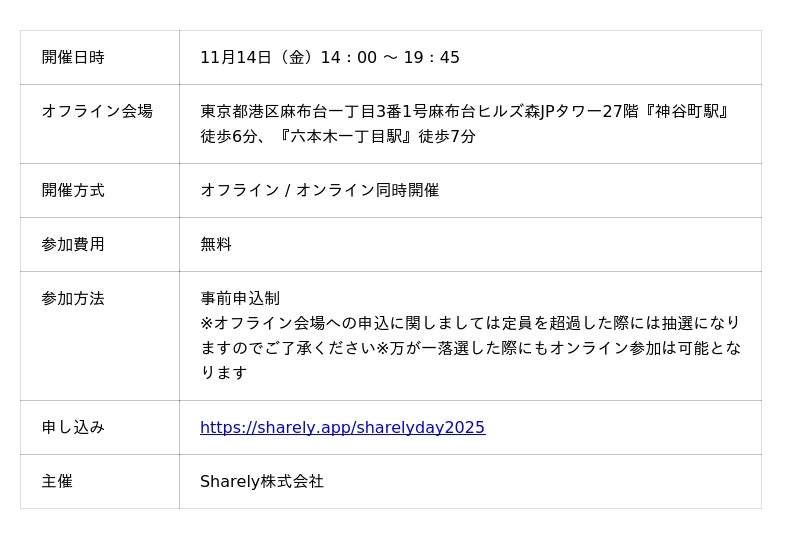 Sharely株式会社(本社:東京都港区、代表取締役:西條 晋一)が提供する株主総会総合支援サービス「Sharely(シェアリー)」は、今年で4回目となるオンラインとオフラインのハイブリッドイベント「Sharely Day 2025」を11/14(金)に開催することをお知らせします。