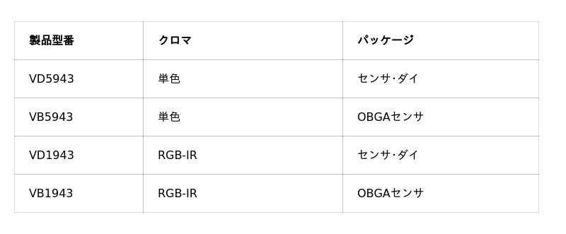 - 4つの新しい5MPイメージ・センサにより、最適化された高速かつ高精細な画像撮影で顧客製品を柔軟にサポート- 高速の自動化製造工程や物体追跡に最適な新しい製品ファミリ- グローバル・シャッターとローリング・シャッターを備えた業界最先端の技術を活用し、2.25µmのピクセル技術と先進的な3D-IC、およびオンチップRGB-IR分離機能を搭載