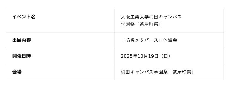 株式会社Meta Heroes(本社所在地:大阪府大阪市、代表取締役:松石和俊、以下「当社」)は、2025年10月19日(日)に大阪工業大学梅田キャンパスで開催された学園祭「茶屋町祭」において、「防災メタバース」体験会のブース出展を実施し、盛況のうちに終了しましたことをご報告いたします。