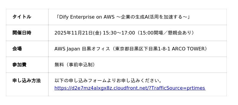 株式会社LangGeniusは、アマゾン ウェブ サービス ジャパン合同会社(AWS Japan)と共同で、企業の生成AI活用をテーマとしたイベント「Dify Enterprise on AWS ~セキュアなデータ活用とパートナー導入事例~」 を開催いたします。