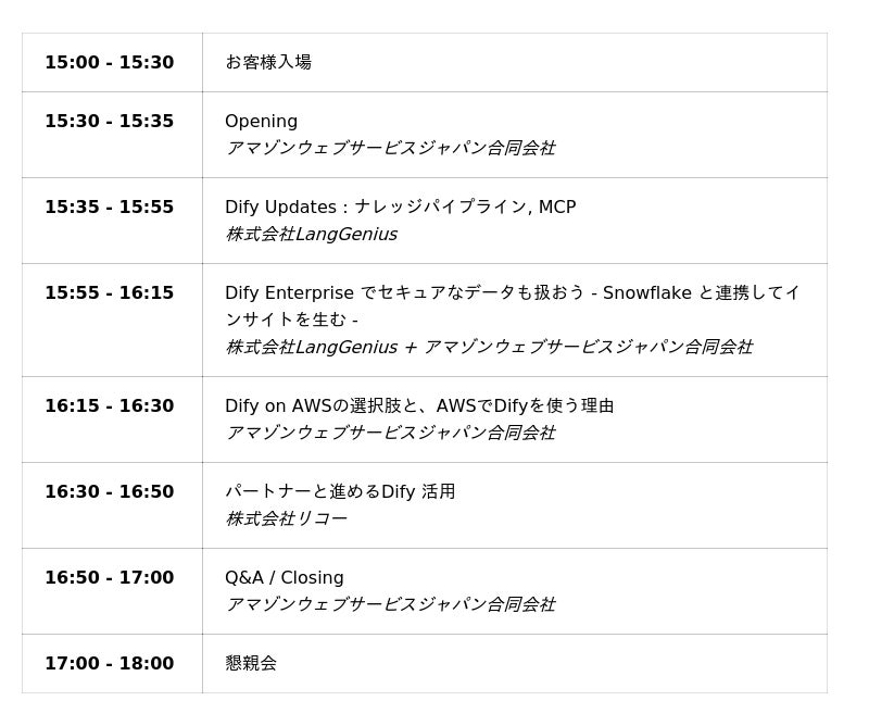 本イベントでは、Dify Enterpriseの最新機能やSnowflakeなどの機密データソースとの安全な連携方法、さらにAWSとの連携による企業導入事例を紹介します。また、LangGeniusのパートナー企業である株式会社リコーによる登壇セッションも予定しています。