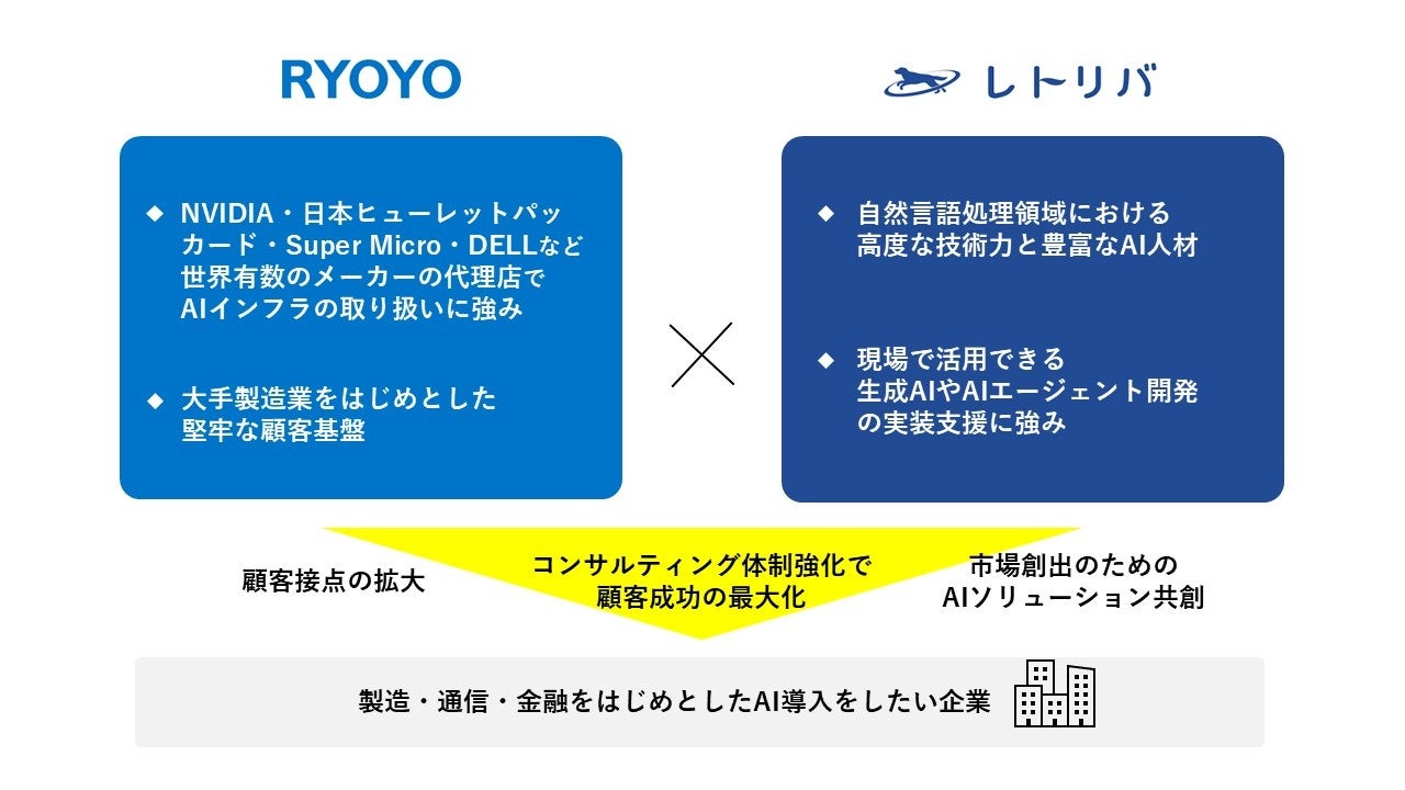 レトリバは、自然言語処理とAIエージェント開発の実績をもとに実装力を強化し、菱洋エレクトロは、GPU・ネットワークなどのインフラ支援を軸に導入を支えます。