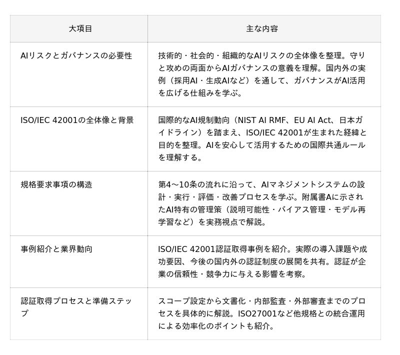 実務経験と最新の知見を交え、ISO/IEC 42001の基礎から導入・運用までを体系的に学べる内容となっています。