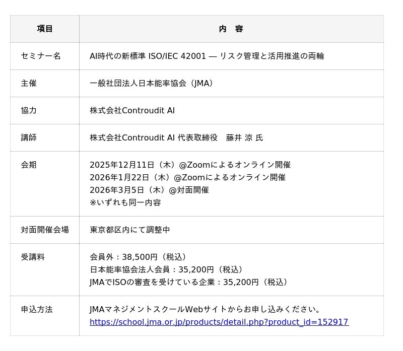 一般社団法人日本能率協会(JMA、会⾧:中村正己)は、AIガバナンスとリスクマネジメントの両立を図るため、ISO/IEC 42001を初めて学ぶ方やAI・DX活用推進部門の方などを対象としたセミナー「AI時代の新標準 ISO/IEC 42001 ― リスク管理と活用推進の両輪」を、2025年12月からオンラインと対面で新たに開講します。